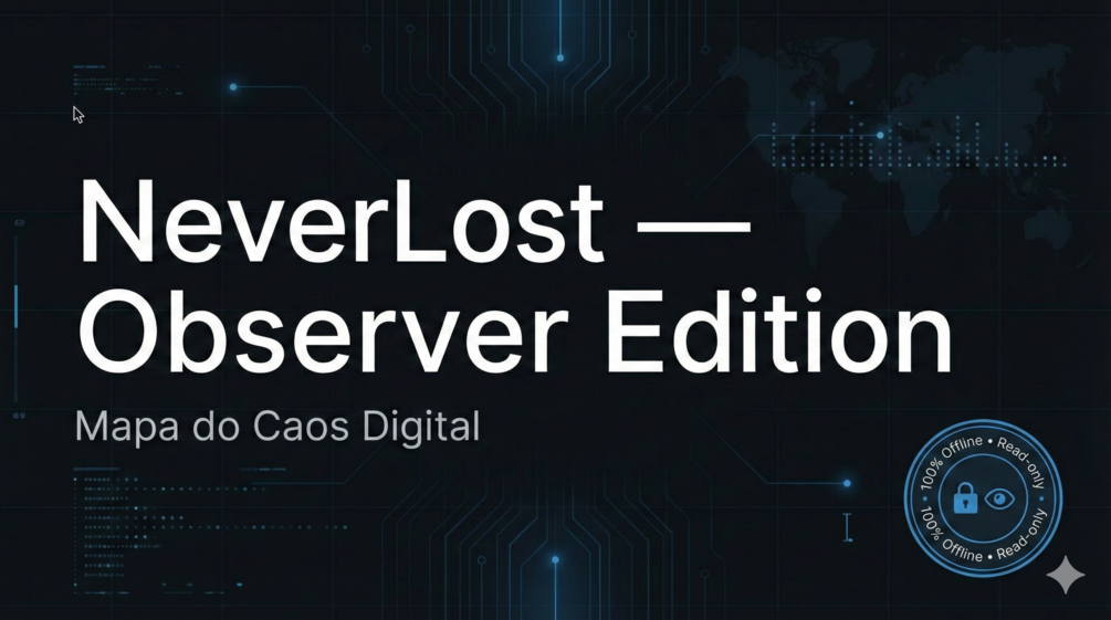O NeverLost resolve isso do jeito certo: ele mapeia seus discos localmente, sem apagar, mover ou alterar nada, e te entrega um relatório visual em HTML + um banco incremental (SQLite) pra você finalmente enxergar o seu caos.